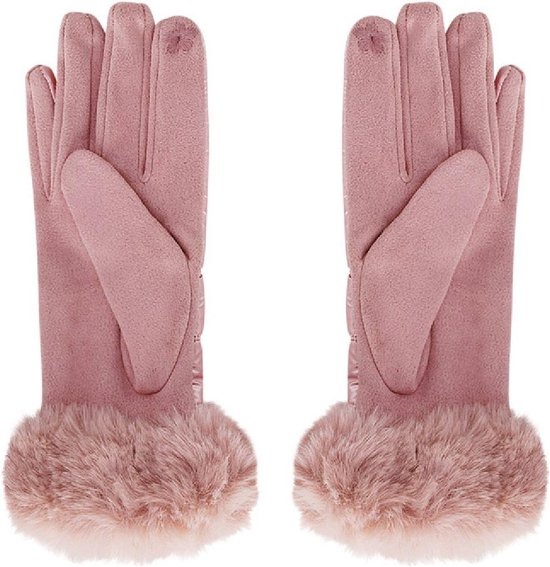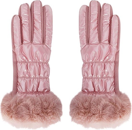 Hoe tof zijn deze metallic handschoenen met bont in de kleur roze van Yehwang. Combineer deze handschoenen met een bijpassende sjaal en muts en jij bent helemaal klaar voor de winter! De handschoenen zijn gemaakt van 100% polyester.