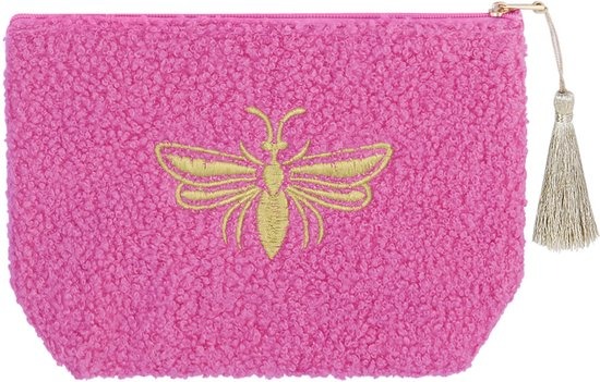 Hoe schattig is deze make-up tas met gouden bij? Al jouw essentials passen in deze make-up tas. De tas is gemaakt van polyester en heeft de volgende afmetingen: 19.5 x 13.5 x 5.5 centimeter.