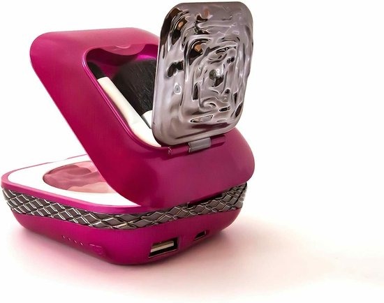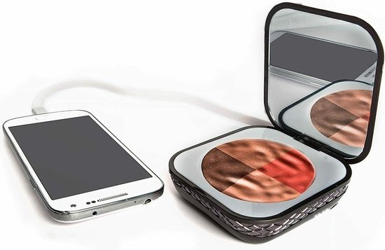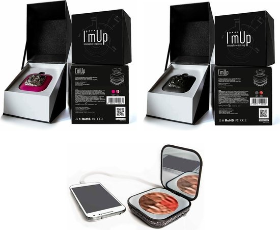 Het bestaat uit twee parallel geschakelde cellen van 3,7 volt om een maximaal laadvermogen van 4300 mAh te krijgen. Kleine afmetingen - hoge prestaties: Deze worden bereikt door een hoge energiedichtheid. De draagbare oplader heeft een vermogen van 2,1 ampère en een ingang van 1,0 ampère. In korte tijd kan de I'mUp de batterij van elke smartphone, tablet of ander USB-apparaat volledig opladen en blijft toch klein en licht en is met 165 gram gemiddeld lichter dan een smartphone. De I'mUp-kit bevat een USB-kabel van 40 cm, 2 miniborstels van synthetische vezels en een handige pochette 3 kleuren blush-palet Geïntegreerde powerbank (4300 mAh max. oplaadcapaciteit) een verlichte spiegel + een kleine vergrotende spiegel Palet verwisselbaar Make-up kit met 2 mini kwasten - USB-kabel - Pochette