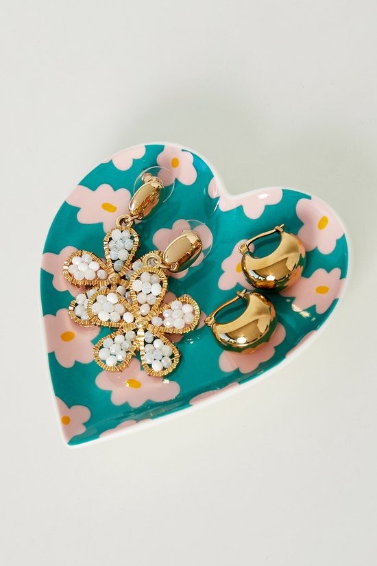 Dit prachtige hartvormige ringen/sieraden schaaltje is een perfecte aanvulling voor elke ruimte. Gemaakt van hoogwaardig keramiek, biedt dit schaaltje niet alleen een unieke uitstraling met zijn groen en roze bloemen, maar is ook functioneel met een afmeting van 9,5 cm. Ideaal als sieraden display of als decoratief schaaltje, voegt het een speelse en kleurrijke touch toe aan uw interieur. Maak uw huis compleet met dit charmante item dat zowel stijl als veelzijdigheid biedt.