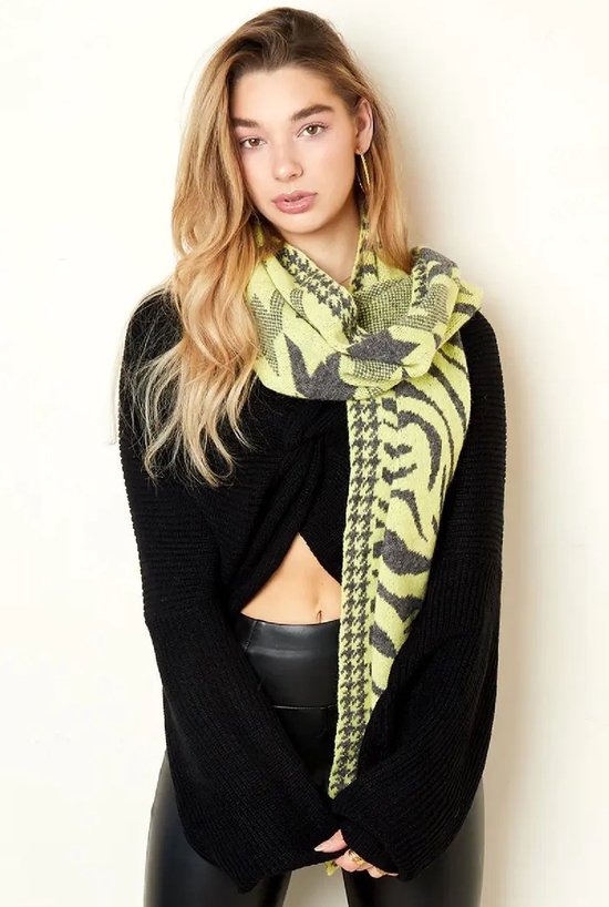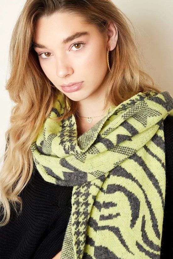 Opvallende Combi Print: Deze wintersjaal valt op door zijn unieke combinatie van tijgerprint en abstracte elementen, wat een artistieke en trendy flair geeft. De kleurencombinatie van geel en zwart maakt de sjaal veelzijdig en gemakkelijk te combineren met diverse outfits.