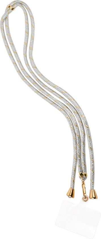Ben jij op zoek naar een trendy telefoonkoord? Dan is deze goud/zilver met gouden telefoonkoord in leuke subtiele print met eenvoudig kaartje voor bevestiging echt iets voor jou! Superleuk en erg handig om dit telefoonkoord tijdens een tof evenement te dragen. Het telefoonkoord is gemaakt van polyester, pvc en metaal en heeft een afmeting van 160 cm.