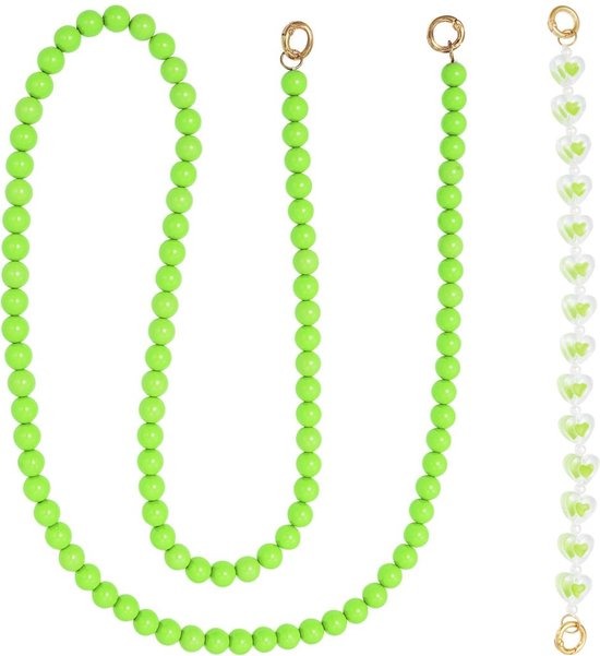 Shop deze leuke telefoonsnoer met lange en korte riem bij She life style! Het lange telefoonkoord is gemaakt van groene kralen met een glanzende look. Het korte koordje is gemaakt van transparante kralen met groene hartjes. De kralen zijn gemaakt van acryl, de uiteinden zijn gemaakt van alloy in de kleur goud.
