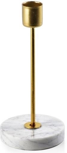 Een moderne set kandelaar uit de serie CEDRIC MARBLE van MONDEX. Gemaakt van conglomeraat en goudkleurig metaal. Voor één tafelkaars. De onderkant is beschermd met folie, die moet worden verwijderd voordat de kaars wordt geplaatst.