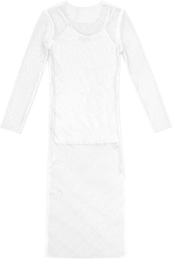 Deze jurk wordt geleverd met een bijpassende witte onderjurk van zachte viscose met stretch. De onderjurk biedt voldoende bedekking en blijft prettig aanvoelen, of je nu een avond uit gaat of een festival bezoekt. De combinatie van doorschijnende stof met glinsterende accenten maakt dit item onweerstaanbaar.