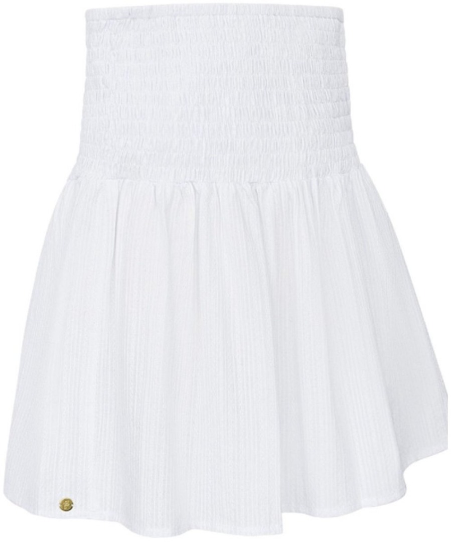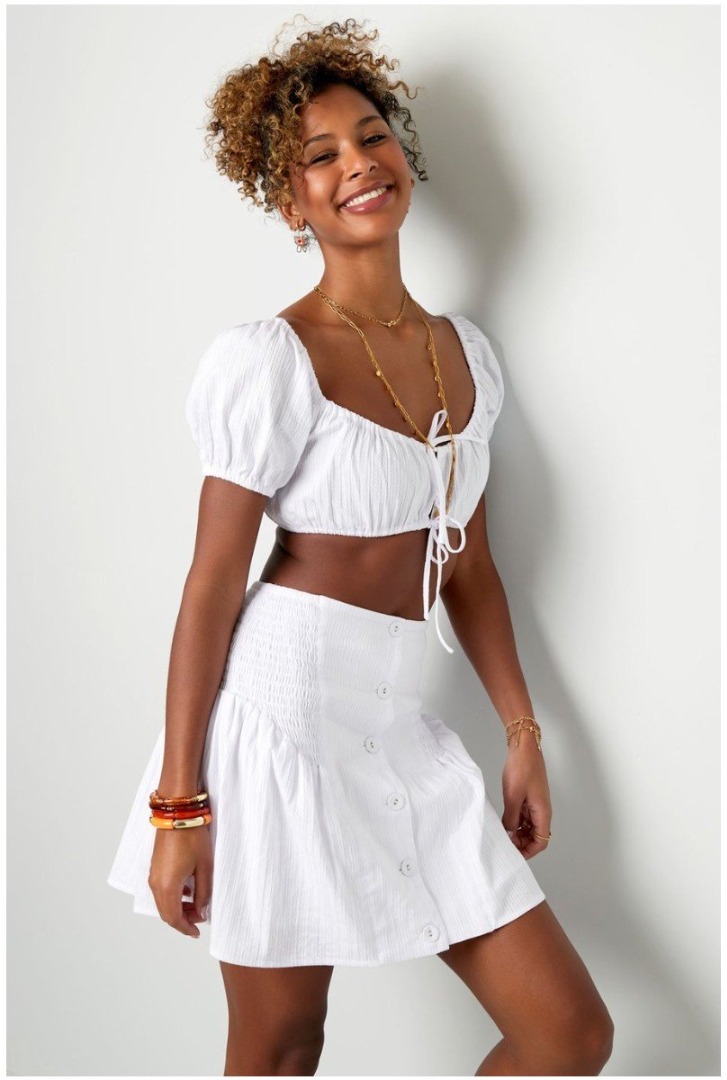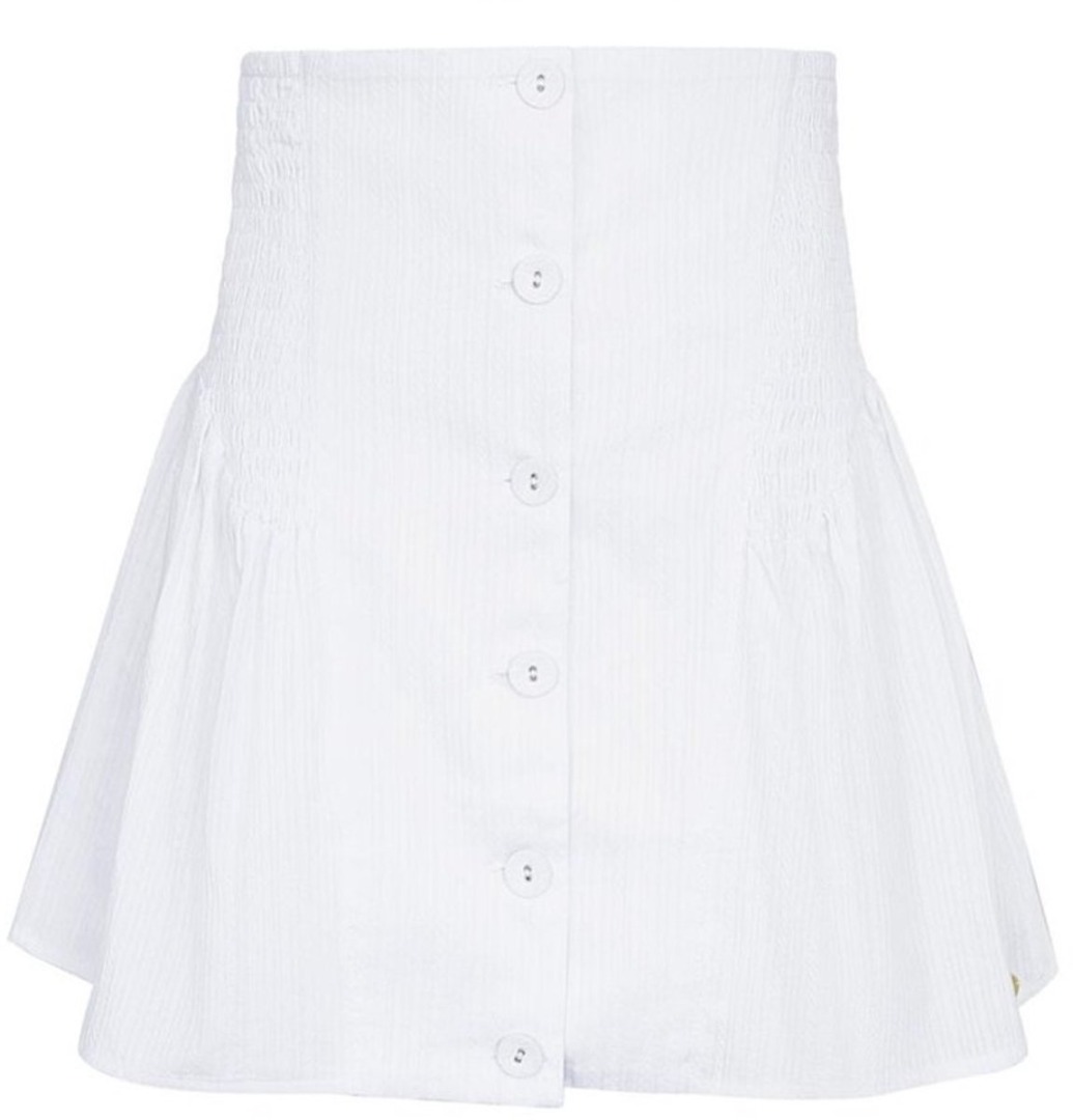 Hoe leuk is dit witte rokje met knopen en smock detail voor aankomend seizoen! Het rokje is mooi getailleerd waardoor de rok aansluitend valt. Daarnaast valt de rok tot boven de knie. Je kunt deze witte rok perfect combineren met een leuk topje, t-shirt of blouseje! Stijl deze rok met hakken voor een leuk feestje of juist met stoere boots voor een tof festival. Deze rok is gemaakt van 100% katoen en is verkrijgbaar in de maat S