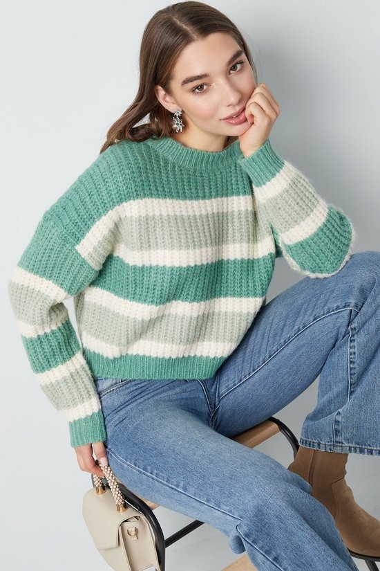 Op zoek naar de perfecte warme trui met strepen voor de herfst en winter? Dan is dit het item voor jouw winkel! Combineer deze trui met onze leren broeken of pantalons en jouw klant is ready to go. De trui is gemaakt van 45% acryl, 30% polyester en 25% nylon.
