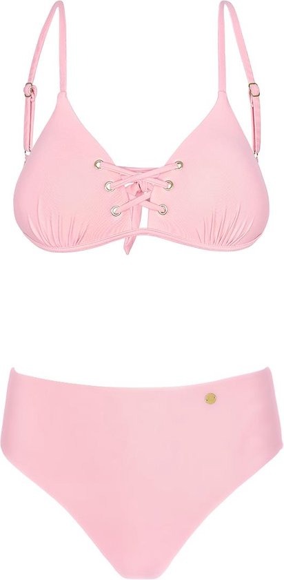 Voeg een vleugje kleur toe aan je dag met onze mooie pastelkleurige bikini's met kanten details. De veter aan de bovenkant is niet verstelbaar.Dankzij de hoge taille van de broek, deze bikini past prachtig bij elke lichaamsvorm en maat. De gewatteerde top heeft eenbeugel, niet-verwijderbare vulling en verstelbare bandjes.