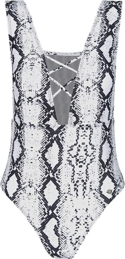 Het badpak is verkrijgbaar in twee beestachtige kleuren: zwart-witte slang, zwarte en bruine panter.