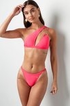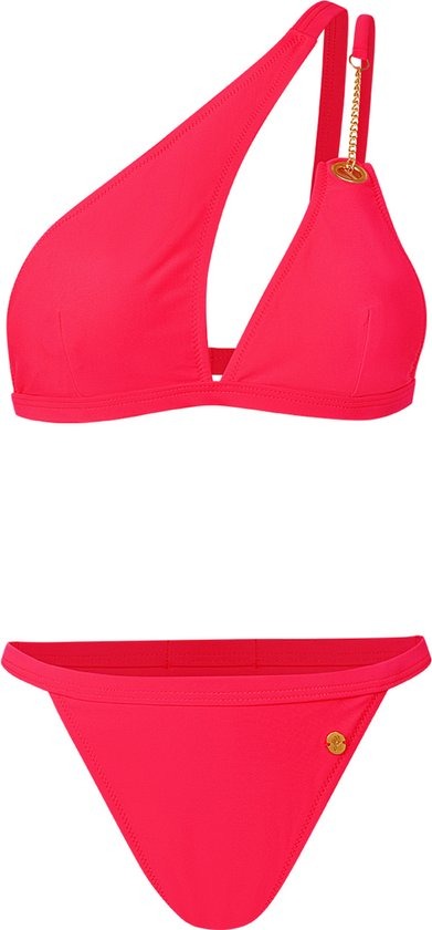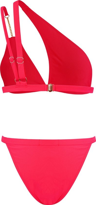 Hoe leuk is deze rode one schouder bikini met gouden kettinkje! De bikini is erg trendy door het one shoulder detail en kan ook leuk gecombineerd worden met een denim short. Combineer de bikini met een leuke hoed en zonnebril en jij bent klaar voor een heerlijk stranddagje! De bikini is gemaakt van 82% Nylon en 18% Spandex. Deze prachtige bikini is verkrijgbaar in de kleuren rood en zwart.