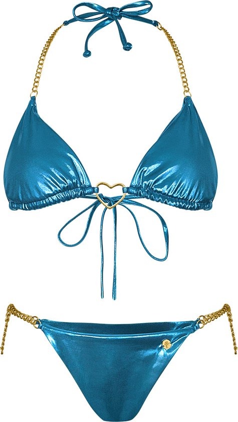 Hoe tof is deze blauwe metallic bikini met gouden details! De metallic kleur in combinatie met de gouden opvallende details maken van deze bikini een echt statement item! De bikini is perfect geschikt voor een stranddagje maar kan bijvoorbeeld ook superleuk gestyled worden met een denim short. De top van de bikini sluit met een strik knoop en heeft een leuk gouden hartje in het midden. De bikini is gemaakt van 95% polyester en 5% spandex en shop je in de maat: S - Verkrijgbaar in de kleuren: blauw - groen - vintage goud - roze.