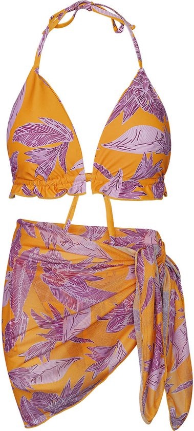 Ben jij op zoek naar een prachtig en trendy bikin met een leuke print voor jouw shop? Bekijk dan snel bikini blaadjes print in de kleurencombinatie oranje en paars! Deze bikini inclusief omslagrokje is perfect voor elke vakantie of strandfeestje en ziet er tevens super trendy uit! De bikini is eenvoudig te sluiten met strikknopen en daardoor ideaal te verstellen. Bikini blaadjes print is gemaakt van 82% nylon en 18% spandex. Je shopt deze prachtige bikini in de kleurencombinaties: oranje/paars en in de maat S