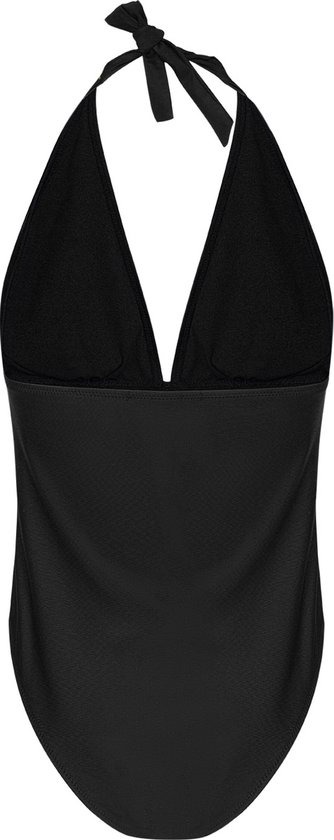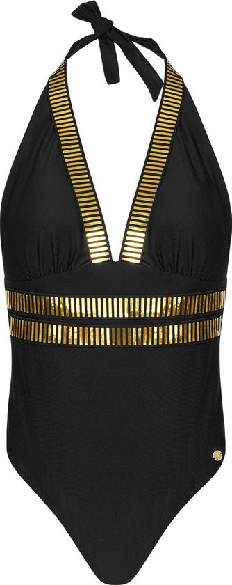 Musthave alert!! Wij zijn verliefd op dit prachtige zwarte badpak met gouden streepjes detaill. Het badpak is voorzien van een laag uitgesneden hals en wordt in de nek gestrikt. Zo kun je het badpak perfect naar maat strikken. Daarnaast is het badpak voorzien van 2 lagen met gouden streepjes. Het badpak is zeer geschikt voor een dagje strand maar kan ook superleuk gedragen worden in combinatie met een denim short. Het badpak is gemaakt van 82% nylon en 18% spandex