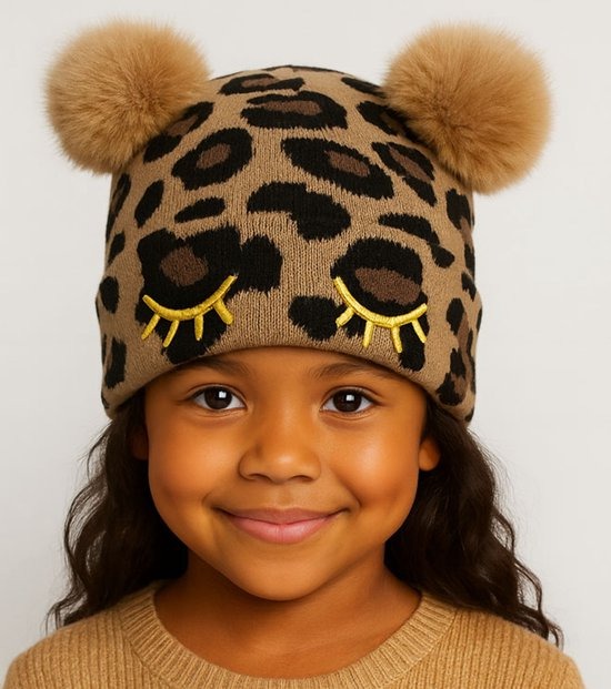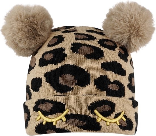 Laat jouw dochtertje trendy zijn met deze leuke muts in panterprint met beige pompons en gouden accentjes.