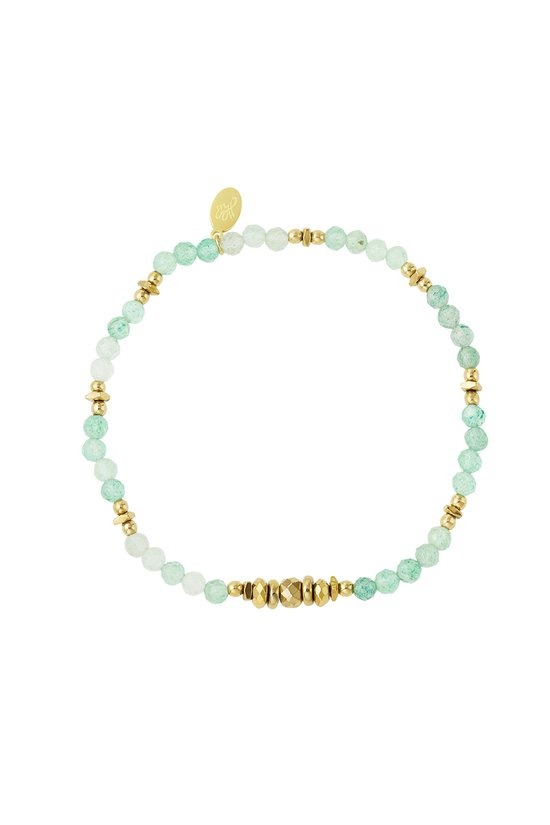 Hoe leuk is dit armbandje met gouden en groene kralen! Het armbandje is de perfecte basic musthave, doordat het armbandje met elke look gecombineerd kan worden! Zo kun je het armbandje perfect stylen tijdens een leuk festival met meerdere armbandjes. Ook kan deze armband perfect enkel gedragen worden tijdens een vakantie bijvoorbeeld. Het kralenarmbandje is gemaakt van hematiet, Stainless steel en steentjes. Het armbandje heeft een afmeting van 16,5 cm en is dankzij het elastiek verstelbaar.