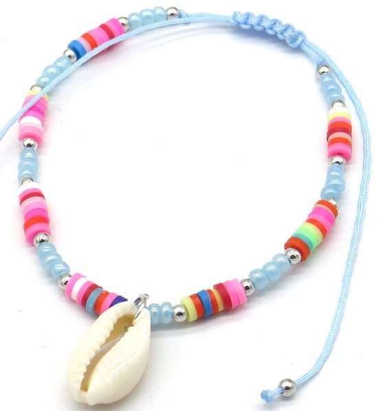 Een super leuk enkelbandje met kralen: zowel platte kunststof kraaltjes als ronde metalen kralen. Voor een onvervalst zomers strandgevoel hangt er ook een schelpje aan het bandje.