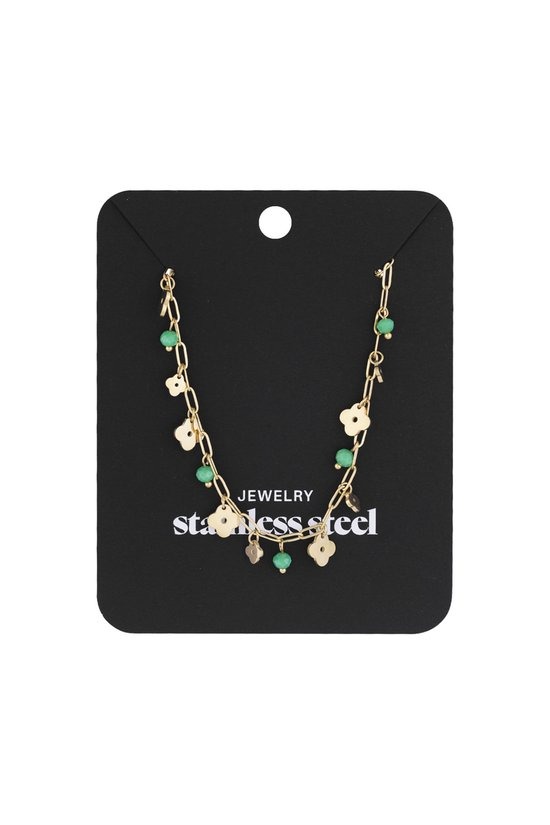 Ontdek de betoverende charme van onze gouden ketting met kleine bedels, een must-have accessoire voor elke modebewuste vrouw. Deze prachtige ketting is vervaardigd uit hoogwaardig roestvrij staal, wat betekent dat het sieraad niet alleen stijlvol is, maar ook 100% waterproof. U kunt het met vertrouwen dragen, ongeacht de gelegenheid, of het nu een dagje uit is of een speciale gelegenheid. De ketting meet 40,5 bij 5 cm en is versierd met delicate klaverbedels, die een speelse en elegante uitstraling geven. Het submateriaal van kristal voegt een sprankeling toe die de aandacht trekt en uw outfit compleet maakt. Voeg een vleugje luxe toe aan uw sieradencollectie met deze veelzijdige en duurzame ketting, perfect voor het combineren met andere sieraden of als statement piece op zich.
