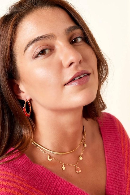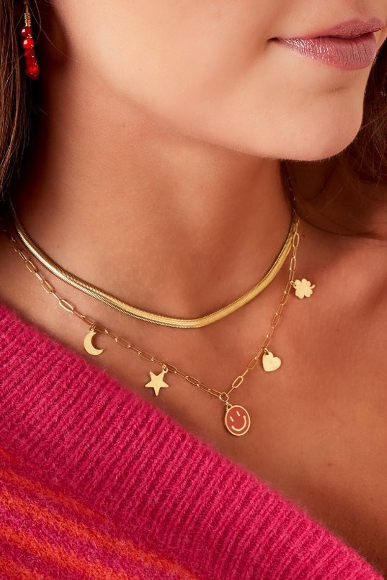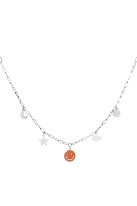 Deze prachtige zilveren schakelketting, vervaardigd uit hoogwaardig stainless steel, is een opvallend sieraad dat elke outfit kan verfraaien. De ketting is niet alleen duurzaam, maar ook stijlvol, met een glanzende afwerking die de aandacht trekt. Wat deze ketting echt uniek maakt, zijn de verschillende vormen bedels die eraan zijn bevestigd, waaronder een grote, vrolijke smiley bedel. Deze bedel, met een levendige oranje plating, is afgewerkt met een laag enamel, wat zorgt voor een extra dimensie en een speelse uitstraling. De combinatie van de schakelketting en de kleurrijke bedels maakt dit sieraad perfect voor zowel casual als meer formele gelegenheden, waardoor het een veelzijdige aanvulling is op uw sieradencollectie.