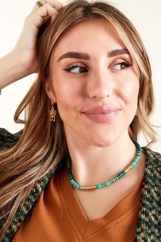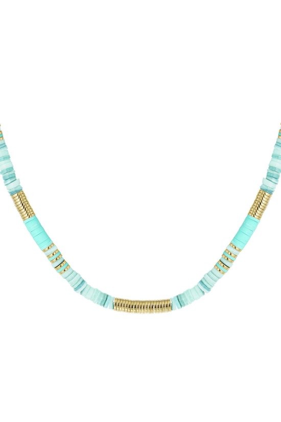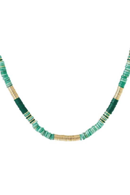 De ketting is gemaakt van stainless steel, polymeerklei, hematiet en zeeschelp.