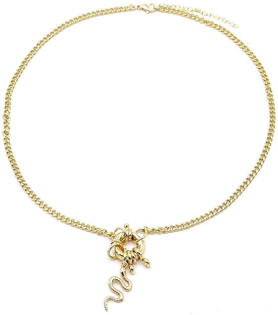 Een leuke en sierlijke ketting die is opgebouwd uit elegante gourmetschakels. In het midden van de ketting hangt een ring met daaraan een aantal bedels, waarbij de grootste bedel de vorm van een slang heeft.
