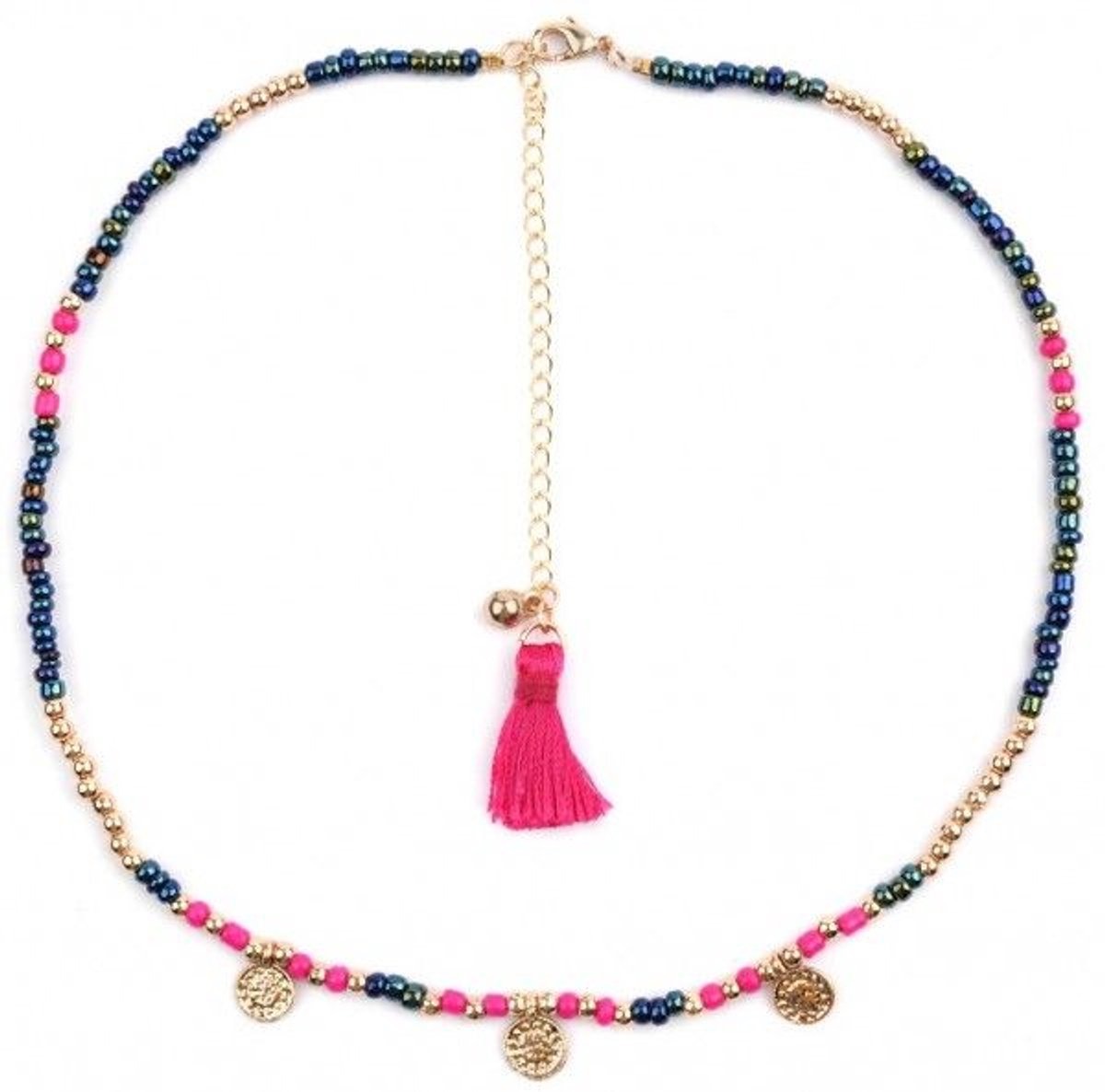 Deze prachtige choker met een gouden ketting en levendige paarse en blauwe kralen is de perfecte aanvulling op jouw sieradencollectie. Met een verstelbare lengte van 36 tot 43 cm past deze choker comfortabel om elke hals en voegt het een speelse, maar elegante touch toe aan elke outfit. De combinatie van de luxe gouden ketting en de opvallende rode en blauwe munten creëert een unieke uitstraling die zowel casual als chic kan zijn. Of je nu een dagje uit gaat of een speciale gelegenheid hebt, deze choker is veelzijdig genoeg om elke look te complementeren. Maak een statement en laat je persoonlijke stijl stralen met deze betoverende choker!