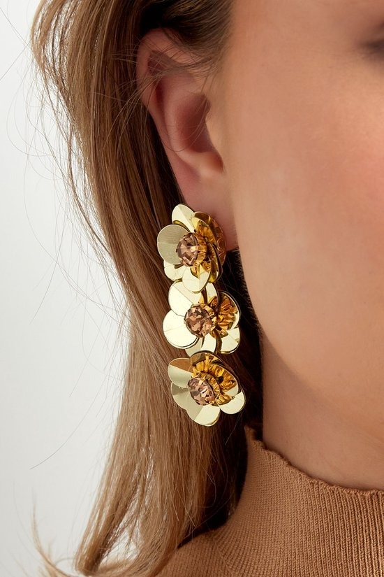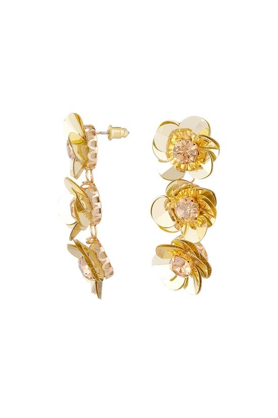 Voeg een vleugje zomerse flair toe aan je sieradencollectie met deze prachtige gouden bloemenoorbellen. Met hun unieke ontwerp van drie bloeiende bloemen zijn deze oorbellen de perfecte aanvulling voor elke outfit, of je nu een casual look of een elegante avondoutfit kiest. Gemaakt van hoogwaardig metaal, PET en sprankelende strass steentjes, stralen ze niet alleen stijl uit, maar zijn ze ook duurzaam en lichtgewicht voor comfortabel dragen. Met een afmeting van 3 bij 4,8 centimeter zijn ze opvallend zonder te overweldigend te zijn. Verkrijgbaar in verschillende kleuren, kun je ze gemakkelijk combineren met je favoriete kledingstukken en accessoires. Maak je look compleet en laat je persoonlijkheid stralen met deze betoverende oorbellen!