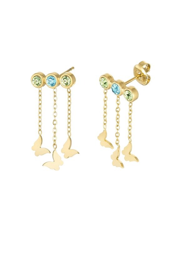 Ben jij voor jouw collectie op zoek naar trendy zilveren oorbellen? Dan zijn deze zilveren oorbellen met schattige vlindertjes, kettinkjes en witte steentjes iets voor jou! De oorbellen zijn mega trendy en daarnaast perfect te combineren met meerdere matchende oorbellen met steentjes! De oorbellen zijn gemaakt van stainless steel en strass steentjes en hebben een afmeting van 2,8 cm. Verkrijgbaar in de kleuren goud/blauw/groen, goud/wit en zilver/wit.