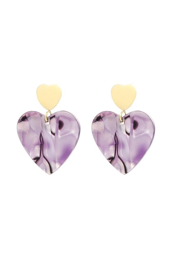 Wauw! Hoe leuk zijn deze gouden oorbellen in de vorm van twee hartjes, waarvan 1 hartje in de kleur paars! De oorbellen zijn een echte musthave en zijn zowel leuk te dragen op een chique manier. Houd jij meer van een speelse look? Combineer dan deze oorbellen met meerdere matchende oorbellen! De oorbellen zijn gemaakt van stainless steel en sheet materiaal. De oorbellen hebben een afmeting van 4,5 cm