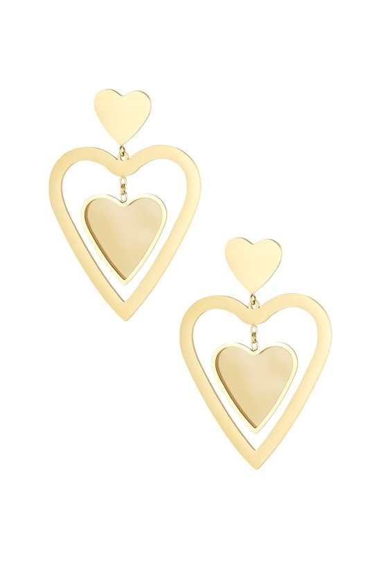 Hoe schattig zijn deze gouden oorbellen met dubbel hartje. De oorbellen hebben een gouden hart en een beige hart. Te leuk om deze oorbellen te combineren met meerdere sieraden met gekleurde details. De oorbellen hebben een afmeting van 4,85 cm en zijn gemaakt van roestvrij staal in combinatie met emaille. Deze oorbellen zijn een echt cadeau-idee.