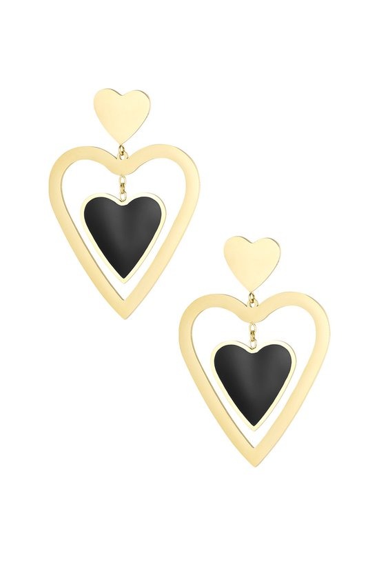 Hoe schattig zijn deze gouden oorbellen met dubbel hartje. De oorbellen hebben een gouden hart en een zwart hart. Te leuk om deze oorbellen te combineren met meerdere sieraden met gekleurde details. De oorbellen hebben een afmeting van 4,85 cm en zijn gemaakt van roestvrij staal in combinatie met emaille. Deze oorbellen zijn een echt cadeau-idee. Verkrijgbaar in de kleuren beige, roze en zwart.