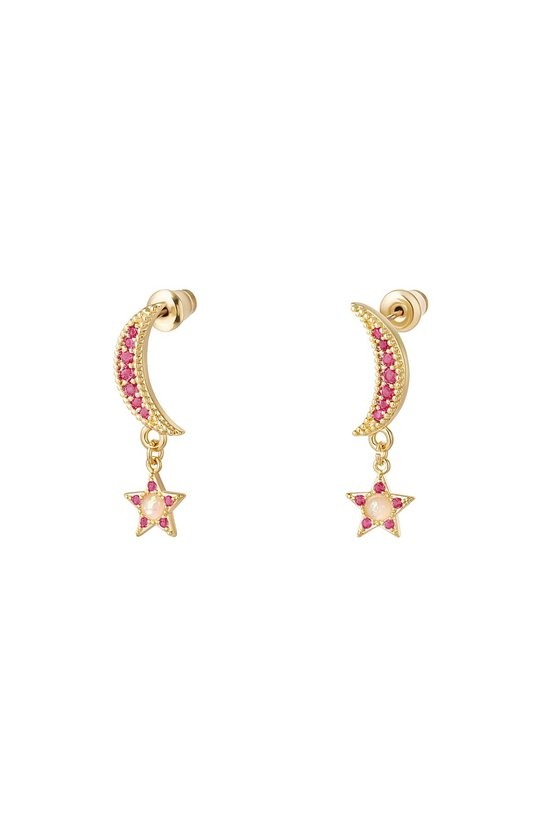 Schattige gouden oorbellen met een hangertje in de vorm van een maantje met een sterretje. De oorbellen zijn gemaakt van gold plated koper. Deze sparkle oorbellen zijn ingelegd met kleine zirkonia steentjes in de kleur fuchsia. De oorbellen zijn 2.9 cm lang en 0.8 cm breed. De oorbellen wegen 2.2 gram. Naast deze fuchsia/gouden kleur is de oorbel in nog drie kleuren beschikbaar: groen/goud, wit/goud en wit/zilver.