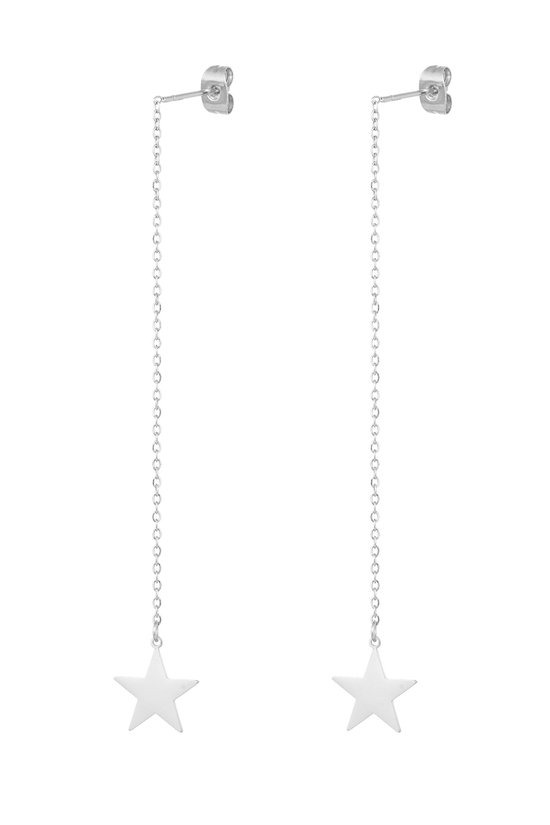Wauw! Hoe leuk zijn deze zilveren hangende oorbellen met een schattig ster. De oorbellen zijn een echte musthave en zijn zowel leuk te dragen op een chique manier. Houd jij meer van een speelse look? Combineer dan deze oorbellen met meerdere matchende oorbellen! De oorbellen zijn gemaakt van stainless steel. De oorbellen hebben een afmeting van 8,5 cm