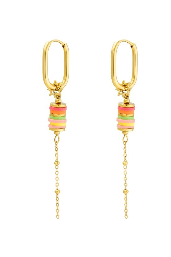 Hoe tof zijn deze gouden ovalen oorbellen met verschillende kraaltjes en een kettinkje van Yehwang! Mega trendy en superleuk te combineren met meerdere matchende oorbellen of andere sieraden. De oorbellen zijn zowel zeer geschikt voor alledaagse als feestelijke momenten en hebben een afmeting van 6,5 cm. De oorbellen zijn gemaakt van stainless steel en polymeerklei en hematiet.