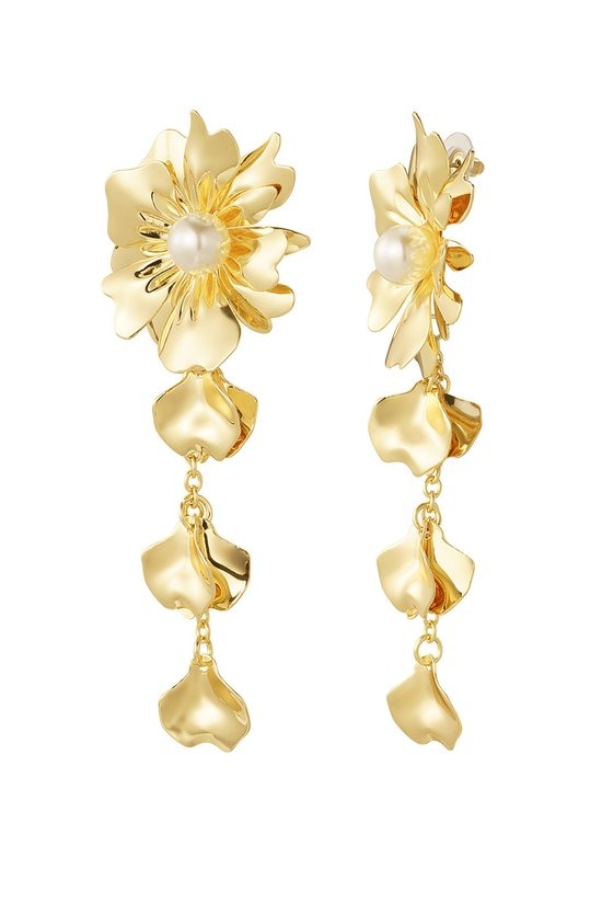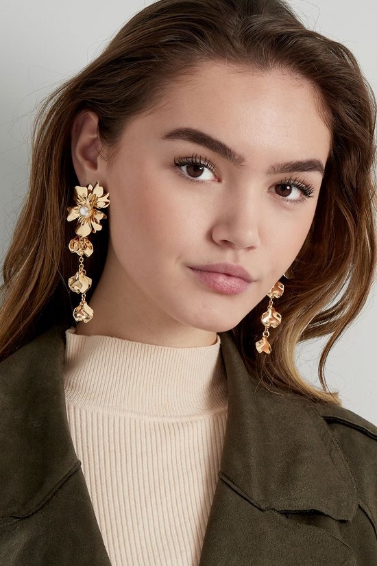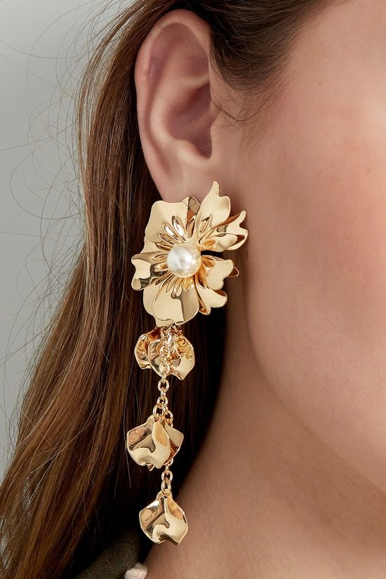 Hoe leuk zijn deze statement gouden oorbellen in de vorm van een prachtige bloem met parel. Superleuk om deze oorbellen te combineren met meerdere sieraden met parels! Ook leuk om deze oorbellen te dragen met een schattige haarband. De oorbellen zijn gemaakt van metaal in combinatie met parels en hebben een afmeting van 10 cm