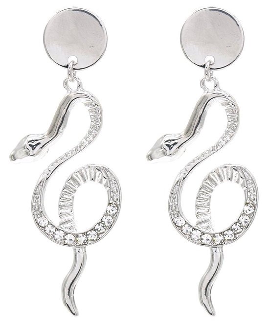 Leuke en mooie oorbellen die zijn opgebouwd uit een rond plaatje met daaronder als hanger een bedel in de vorm van een slang. Een deel van deze slang is bezet met kleine glimmende steentjes.