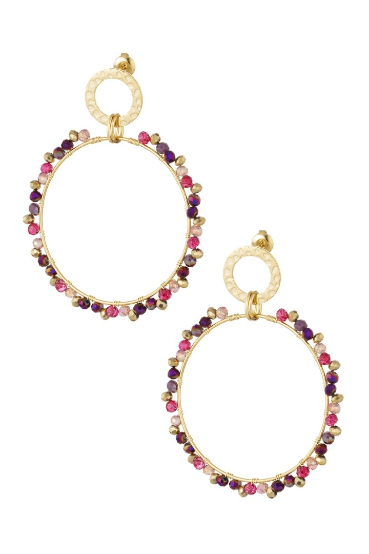 Wauw! Hoe tof zijn deze gouden oorbellen met cirkel detail en cirkel van schakel roze en paarse kraaltjes. De oorbellen zijn perfect te dragen met meerdere kleurrijke oorbellen. Ook leuk om deze oorbellen te combineren met meerdere sieraden van kraaltjes. De oorbellen zijn gemaakt van stainiless steel en kristal kraaltjes en hebben een afmeting van 6,5 cm.