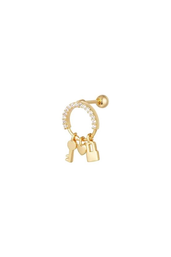 Toffe gouden piercing met drie bedels en zirkonia details. De bedels zijn in de vorm van een sleutel, hartje en slot. Piercing met bedels en zirkonia is gemaakt van koper in combinatie met gold plated en zirkonen steentjes. De steentjes zorgen voor een luxe uitstraling en zijn super leuk te combineren met meerdere sieraden met zirkonen details. De piercing heeft een afmeting van 1,25 cm en is verkrijgbaar in de volgende kleurencombinaties: goud/wit, zilver/wit en goud/multi.