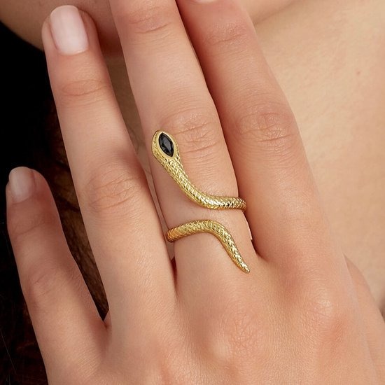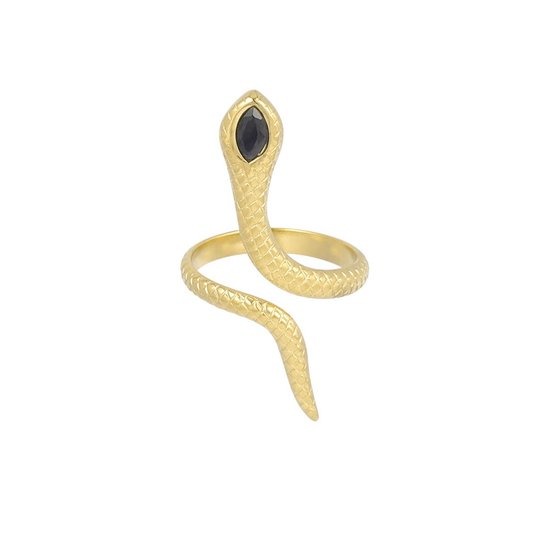 Hoe tof is deze gouden ring in de vorm van een slang met zwart steentje. Superleuk voor bijvoorbeeld een feestje.