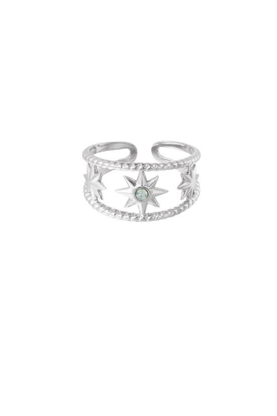 Wow! Hoe tof is deze zilveren eye-catcher ring met groen steentje! Zo leuk om deze ring met meerdere sieraden met sterren details te combineren! De ring is gemaakt van stainless steel in combinatie met strass steentjes en is one size. Doordat de ring one size is, kun je de ring perfect naar jouw vinger vormen.