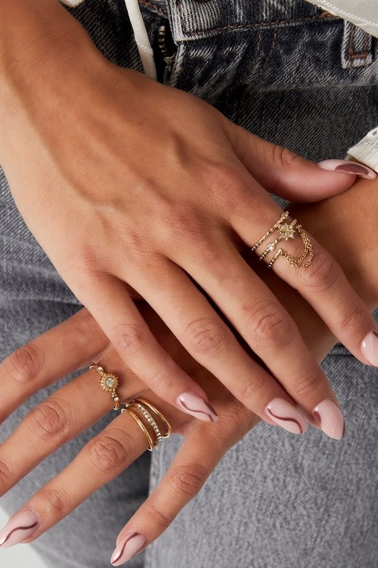 Wauw! Check nu deze toffe gouden ring in bubbel print met schattige witte steentjes en een kettinkje. Erg trendy en mega leuk te stylen met meerdere sieraden met subtiele steentjes. Deze ring kan supergoed enkel gedragen worden maar is ook leuk te combineren met meerdere subtiele ringen voor een complete look. De ring is gemaakt van stainless steel en strass steentjes en is one size, waardoor de ring perfect naar elke vinger gevormd kan worden.