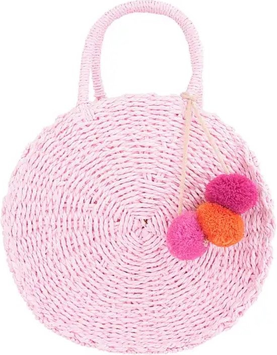 Roze Ronde Rieten Tas met PomPoms: De Perfecte Zomeraccessoire!