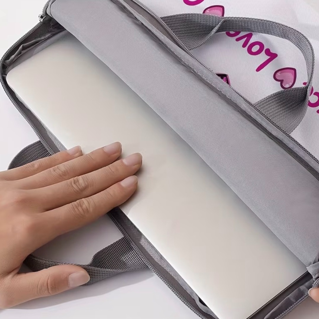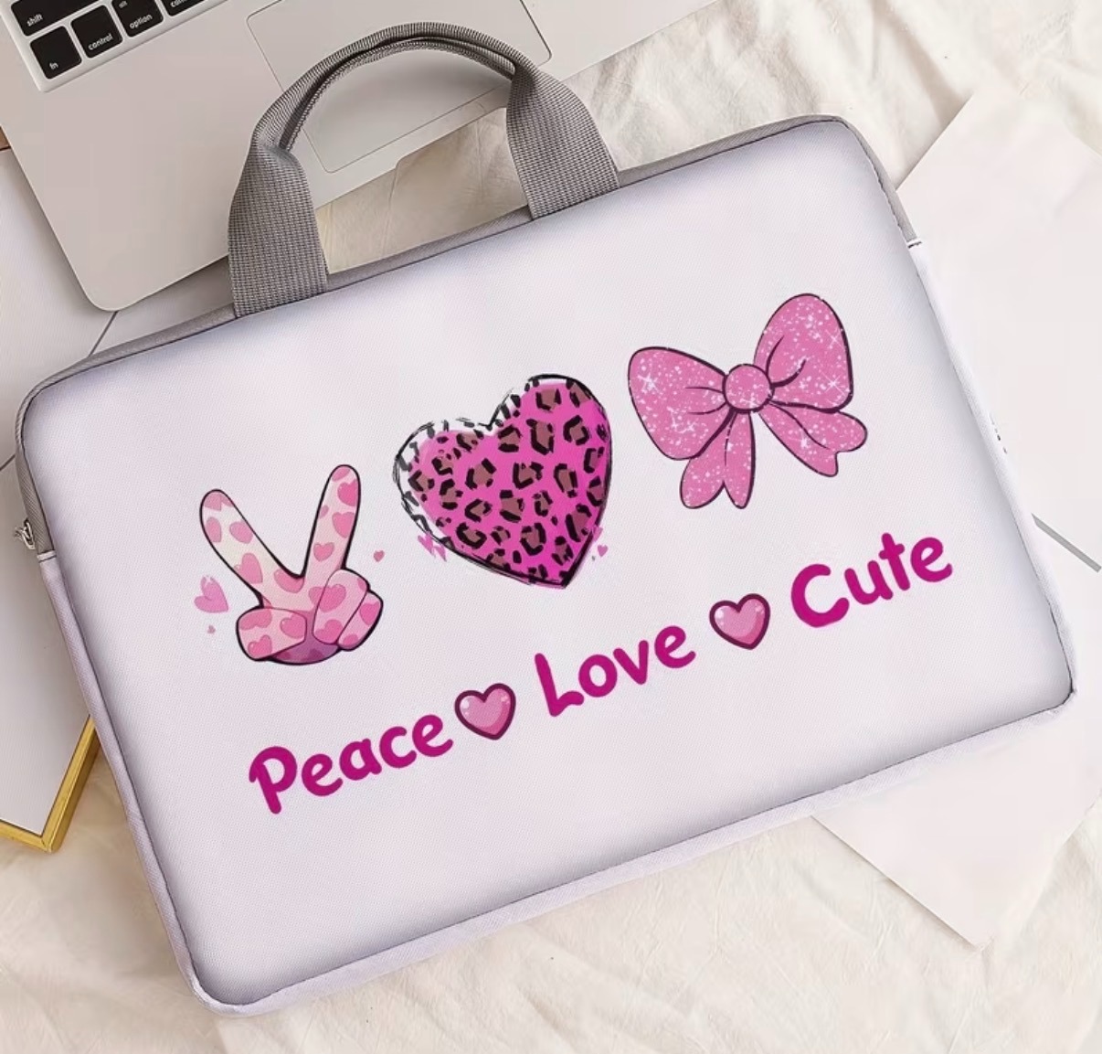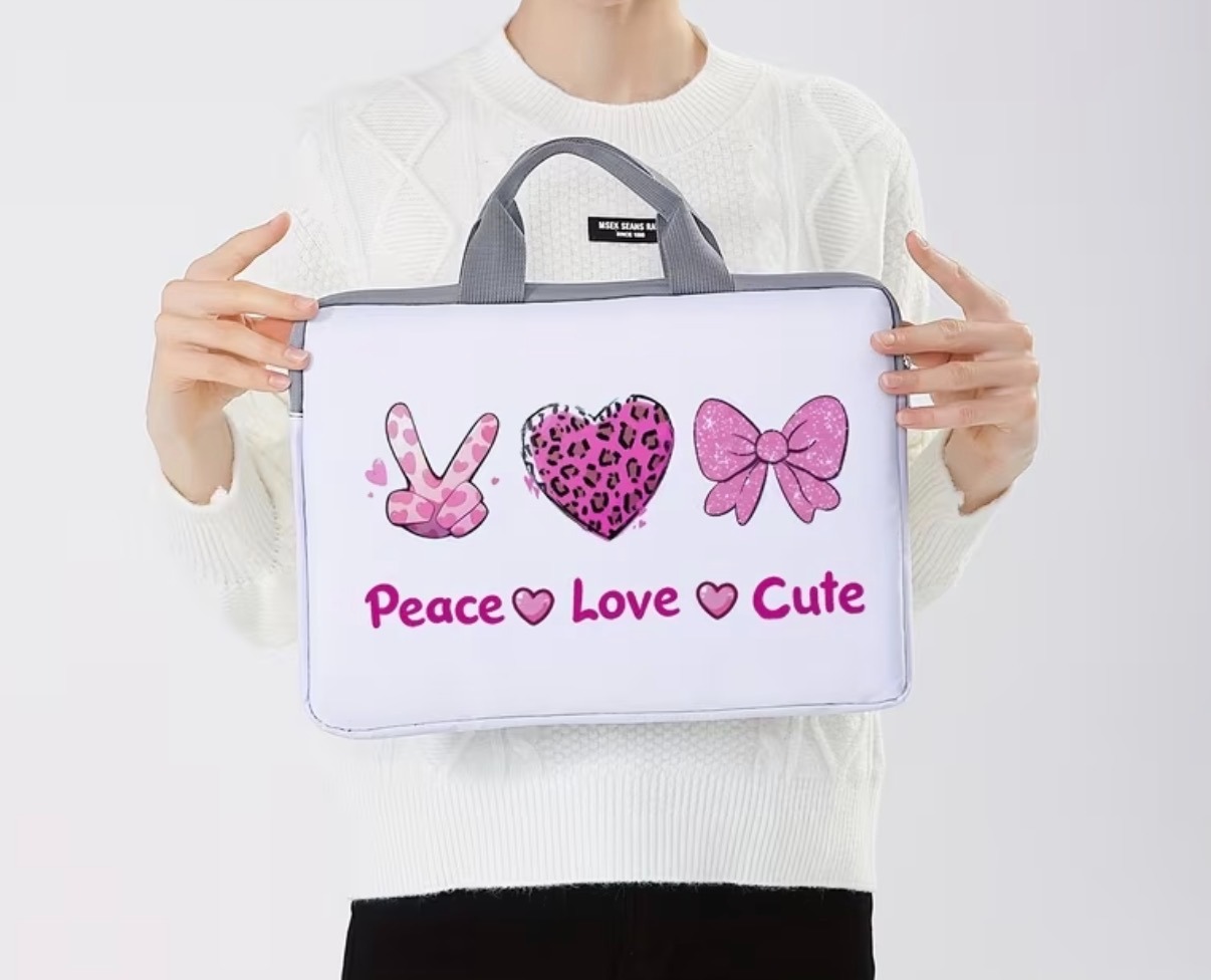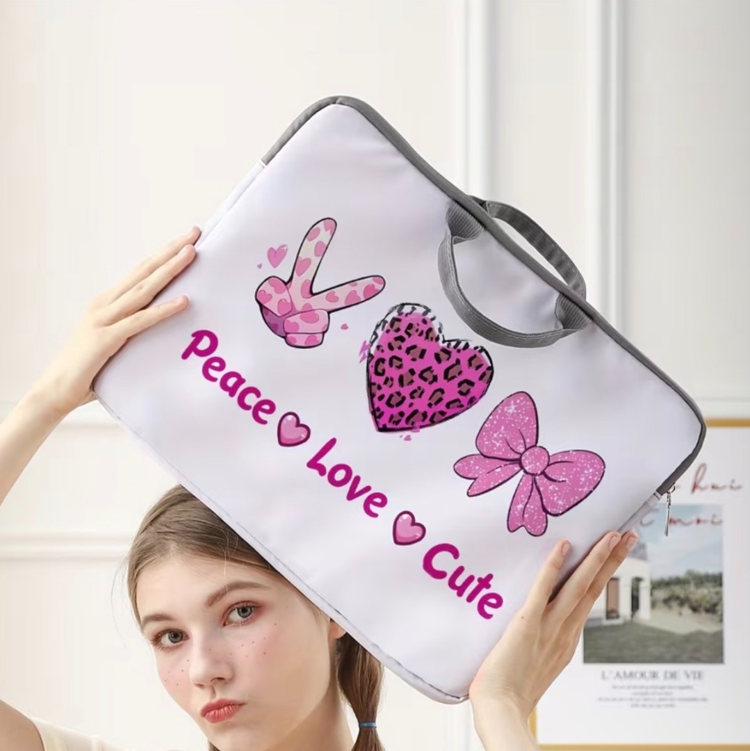 Deze schattige laptop tas, versierd met een inspirerende 'peace love cute' boodschap, is de perfecte combinatie van stijl en functionaliteit. Gemaakt van hoogwaardige, duurzame materialen, biedt deze laptop sleeve optimale bescherming voor uw apparaat tegen krassen en stoten. Het lichte en slanke ontwerp maakt het eenvoudig om uw laptop overal mee naartoe te nemen, of u nu naar kantoor gaat, naar school of op reis. De tas is voorzien van een handige rits en een extra vak voor accessoires zoals opladers en kabels, zodat u alles georganiseerd kunt houden. Met deze laptop tas voegt u niet alleen een vleugje persoonlijkheid toe aan uw dagelijkse uitrusting, maar zorgt u ook voor de veiligheid van uw waardevolle apparatuur. Maak een statement met deze trendy en praktische laptop sleeve!