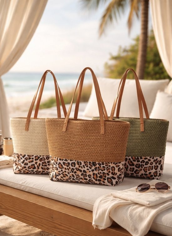 Maak kennis met onze stijlvolle leopard print strandtas, het perfecte accessoire voor al uw avonturen aan zee. Deze tas is vervaardigd met een prachtig geweven ontwerp in een chique luipaardpatroon, waardoor mode en functionaliteit samenkomen in een must-have voor zonnige dagen. Met een royaal interieur van 47 x 36 x 13 cm biedt deze tas voldoende ruimte voor al uw strandbenodigdheden, van handdoeken en zonnebrandcrème tot snacks en een goed boek. De stevige constructie garandeert duurzaamheid, terwijl de opvallende bruintinten en de gedurfde luipaardprint een vleugje glamour aan uw strandlook toevoegen. Of u nu ontspant bij de golven of langs de kust slentert, deze strandtas is ontworpen voor moeiteloze stijl en gemak. Omarm uw wilde kant en maak een statement op het strand met deze prachtige tas!