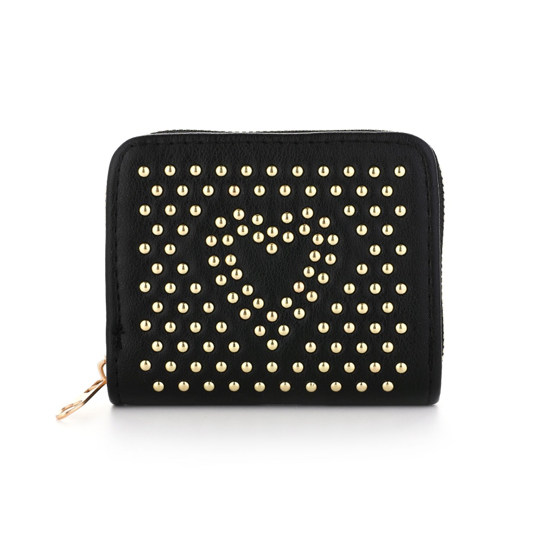 Deze elegante zwarte portemonnee is een must-have accessoire voor elke modebewuste vrouw. Met afmetingen van 9 x 11 x 2 cm is deze portemonnee compact en perfect voor in je tas, terwijl hij toch voldoende ruimte biedt voor al je essentiële items. De opvallende gouden studs in de vorm van harten geven een speelse en romantische touch aan het ontwerp, waardoor deze portemonnee niet alleen functioneel is, maar ook een stijlvol statement maakt. Het hoogwaardige materiaal zorgt ervoor dat de portemonnee duurzaam is en lang meegaat, terwijl de slimme indeling je helpt om je pasjes, briefgeld en munten georganiseerd te houden. Voeg een vleugje luxe toe aan je dagelijkse routine met deze prachtige portemonnee die zowel praktisch als modieus is.