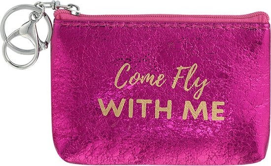 Hoe leuk zijn deze metallic portemonneetjes in de kleur fuchsia met gouden tekst: come fly with me. De portemonnees zijn bevestigd aan een sleutelhanger, waardoor je deze portemonnee perfect kunt verbinden met jouw sleutels. Deze sleutelhangers zijn ook superleuk om cadeau te geven. De portemonnees zijn gemaakt 95% PU en 5% metaal en hebben de volgende afmetingen: 12,5 x 8 cm. Verkrijgbaar in de kleuren: groen, blauw, fuchsia, zwart en goud. Deze metallic tasjes zijn verkrijgbaar in diverse varianten.
