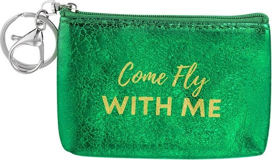 Hoe leuk zijn deze metallic portemonneetjes in de kleur groen met gouden tekst: come fly with me. De portemonnees zijn bevestigd aan een sleutelhanger, waardoor je deze portemonnee perfect kunt verbinden met jouw sleutels. Deze sleutelhangers zijn ook superleuk om cadeau te geven. De portemonnees zijn gemaakt 95% PU en 5% metaal en hebben de volgende afmetingen: 12,5 x 8 cm. Verkrijgbaar in de kleuren: groen, blauw, fuchsia, zwart en goud. Deze metallic tasjes zijn verkrijgbaar in diverse varianten.
