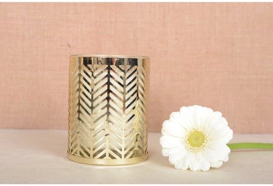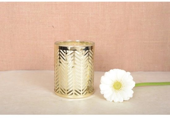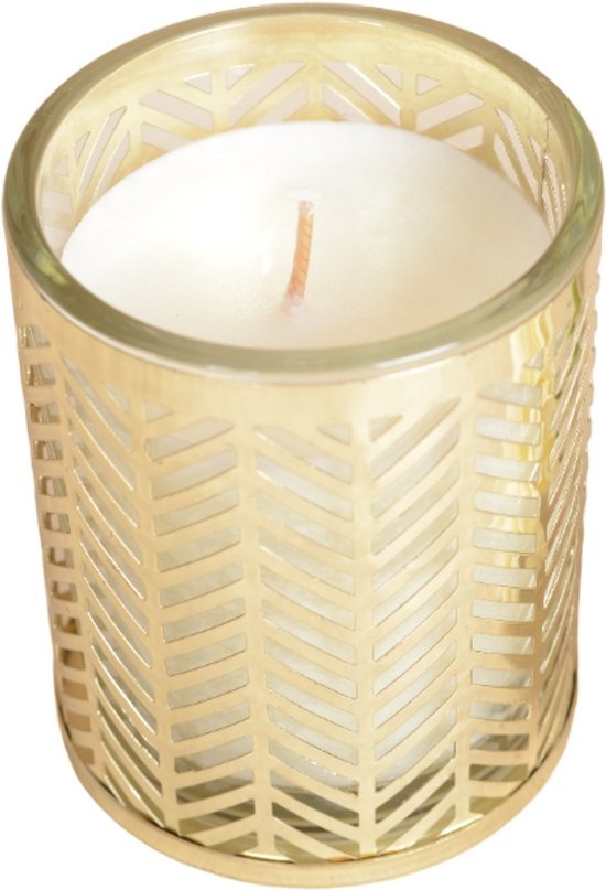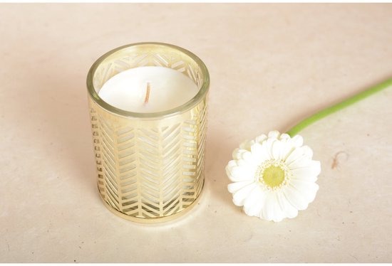 Met zijn gouden metalen ondersteuning versierd met oren, is deze kaars zowel een functioneel object als een decoratieve kamer. Laat u verleid worden door deze subtiele alliantie van de natuur en elegantie, waardoor uw interieur een echte vrede wordt.