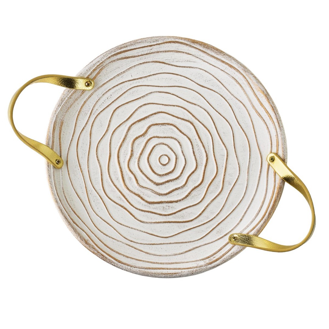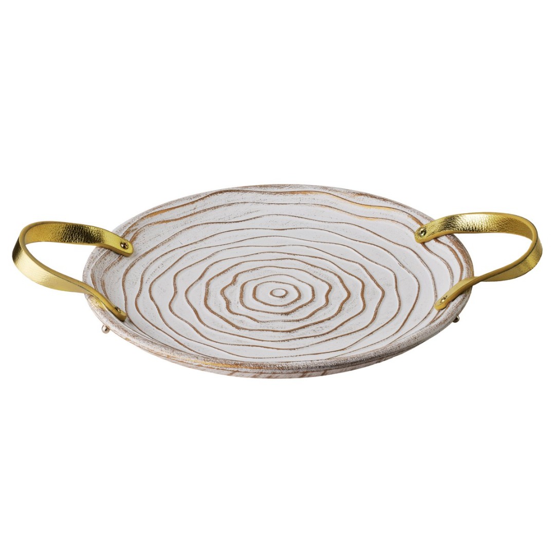 DAZ. Decoratief dienblad 29 x 38 x 3 cm met gouden handvatten. Een elegant decoratief dienblad uit de DAZ collectie van MONDEX. Het is gemaakt van hoogwaardig materiaal en heeft gouden kunstleren handvatten die stijl en comfort toevoegen. Het oppervlak van het dienblad is versierd met een golvend patroon, waardoor het geheel een modern en toch subtiel karakter krijgt. Ideaal als decoratief dienblad voor een tafel, dressoir of console, perfect voor het tentoonstellen van kaarsen, decoraties of snuisterijen. Niet bedoeld voor contact met voedsel.