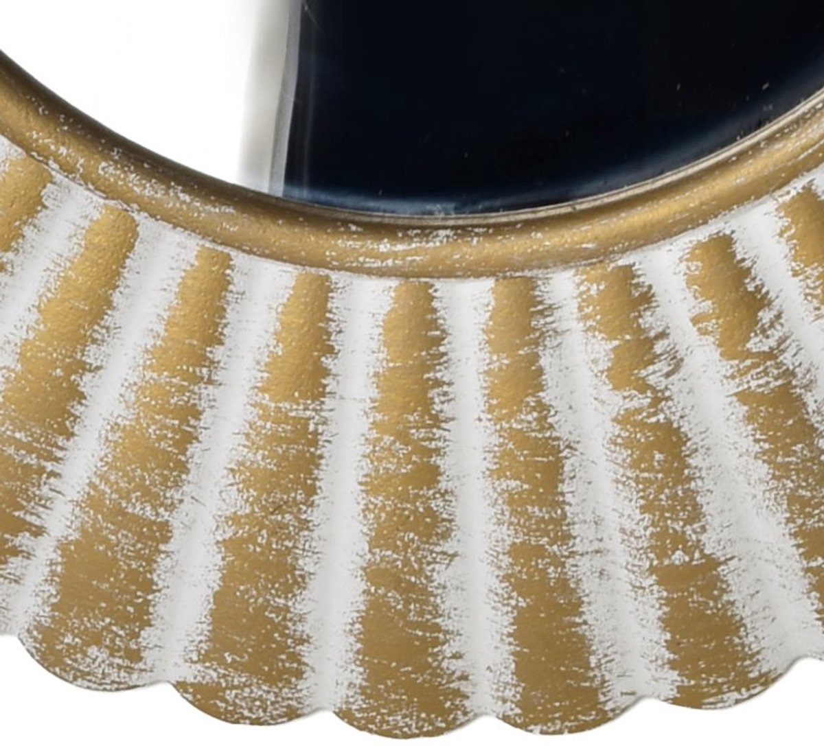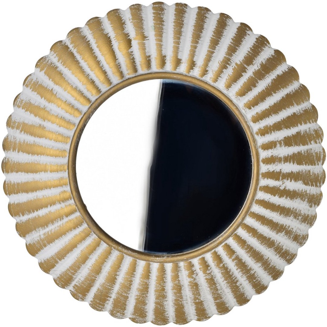 DAZ. Ronde decoratieve spiegel 40 x 40 x 3 cm, wit en goud. Een stijlvolle decoratieve spiegel uit de DAZ collectie van MONDEX. Het ronde wit-gouden frame met een delicaat verweerd effect geeft het stuk een uniek karakter en elegantie. De spiegel heeft een bol ontwerp en de diameter van het reflecterende oppervlak zelf is 21 cm. Het past perfect bij elk interieur, zowel modern als klassiek, en voegt glans, diepte en een stijlvol accent toe.